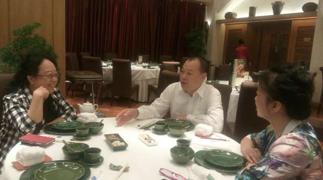 梁玉鹏副会长(中)向吕音(左)介绍丹桂轩经营情况