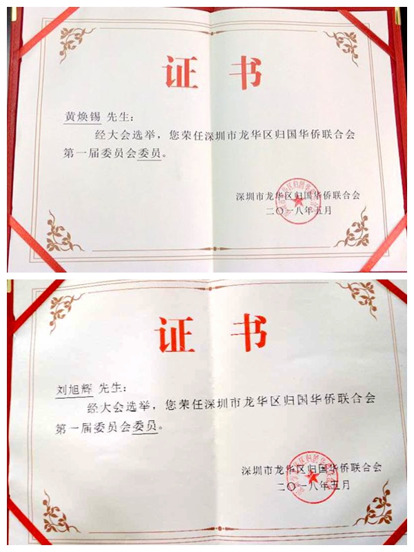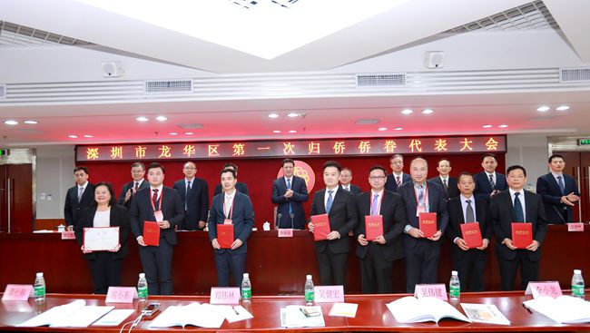 图中李小龙(前排左四)接受龙华区侨联副主席证书